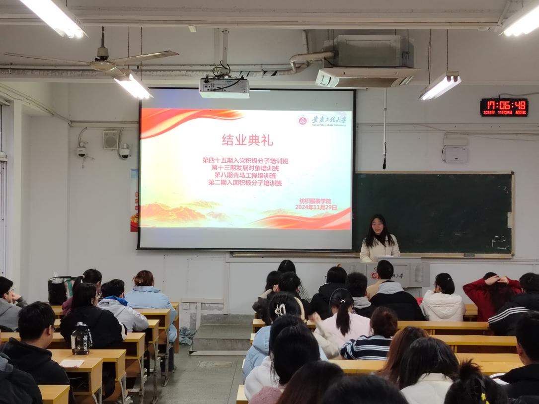 11月29日,纺织服装学院在4教108举行党校培训班结业典礼。学院党委副书记梁雪松、院团委书记陈倩出席典礼,活动由班主任童超梅主持。