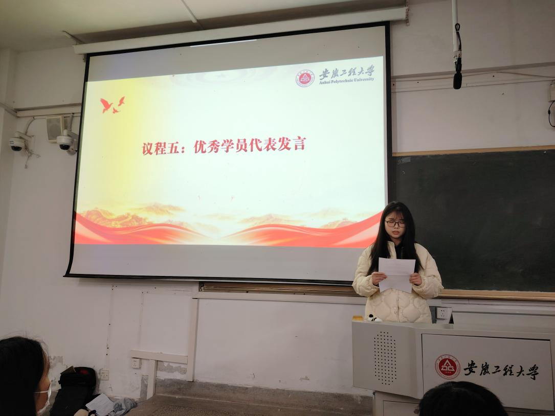 发展对象培训班学员服工212汪元馨作为优秀学员代表上台发言。她表示要继续增强党性修养,将党的理论知识与实践相结合,为建设纺织科技强国贡献青春力量。