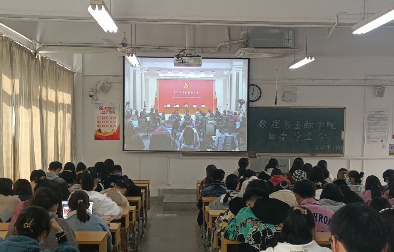 2021年11月12日,中共中央举办新闻发布会,介绍党的十九届六中全会精神。当天上午十点,数理与金融学院组织学生党支部学生与党委理论学习中心组成员共同在1612会议室集中收看直播,中午一点组织全体学生骨干在4教109教室集中收看。党的十九届六中全会精神在学生中引发热议。
